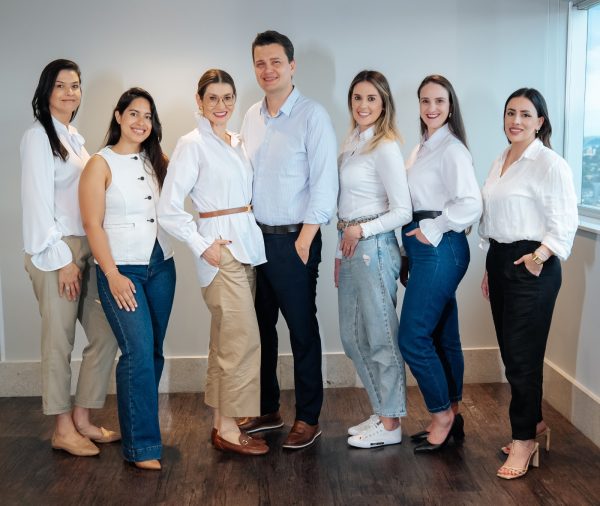 Equipe Reviver/Clínica Santa Ágata. Da esquerda para a direita – Letícia Carvalho (comercial); Caroline Silveira (personal trainer); Dra. Janaína Brollo (oncologista); Dr. Maximiliano Kneubil (mastologista); Fran Guimarães (psicóloga); Gisela Quissini (nutricionista); Juliana Rodrigues (comercial/marketing). A equipe também é composta pelo educador físico Pedro Lopez.