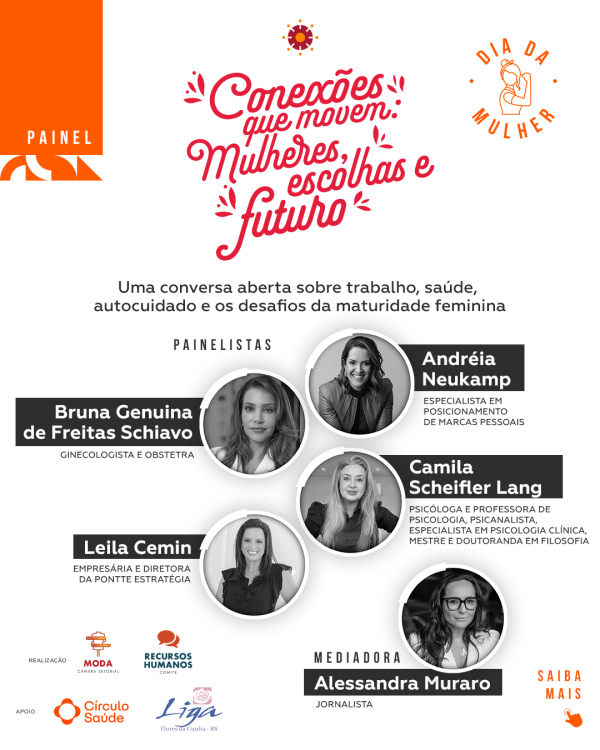 O encontro terá início às 19h, com coquetel de recepção, networking e quick massage. Às 20h, começa o painel, que reunirá as convidadas Andréia Neukamp, especialista em posicionamento de marcas pessoais; Bruna Genuina de Freitas Schiavo, ginecologista e obstetra; Camila Scheifler Lang, psicóloga, psicanalista e especialista em Psicologia Clínica; e Leila Cemin, empresária e diretora da Pontte Estratégia. A mediação será da jornalista e coordenadora de comunicação do CE, Alessandra Muraro.